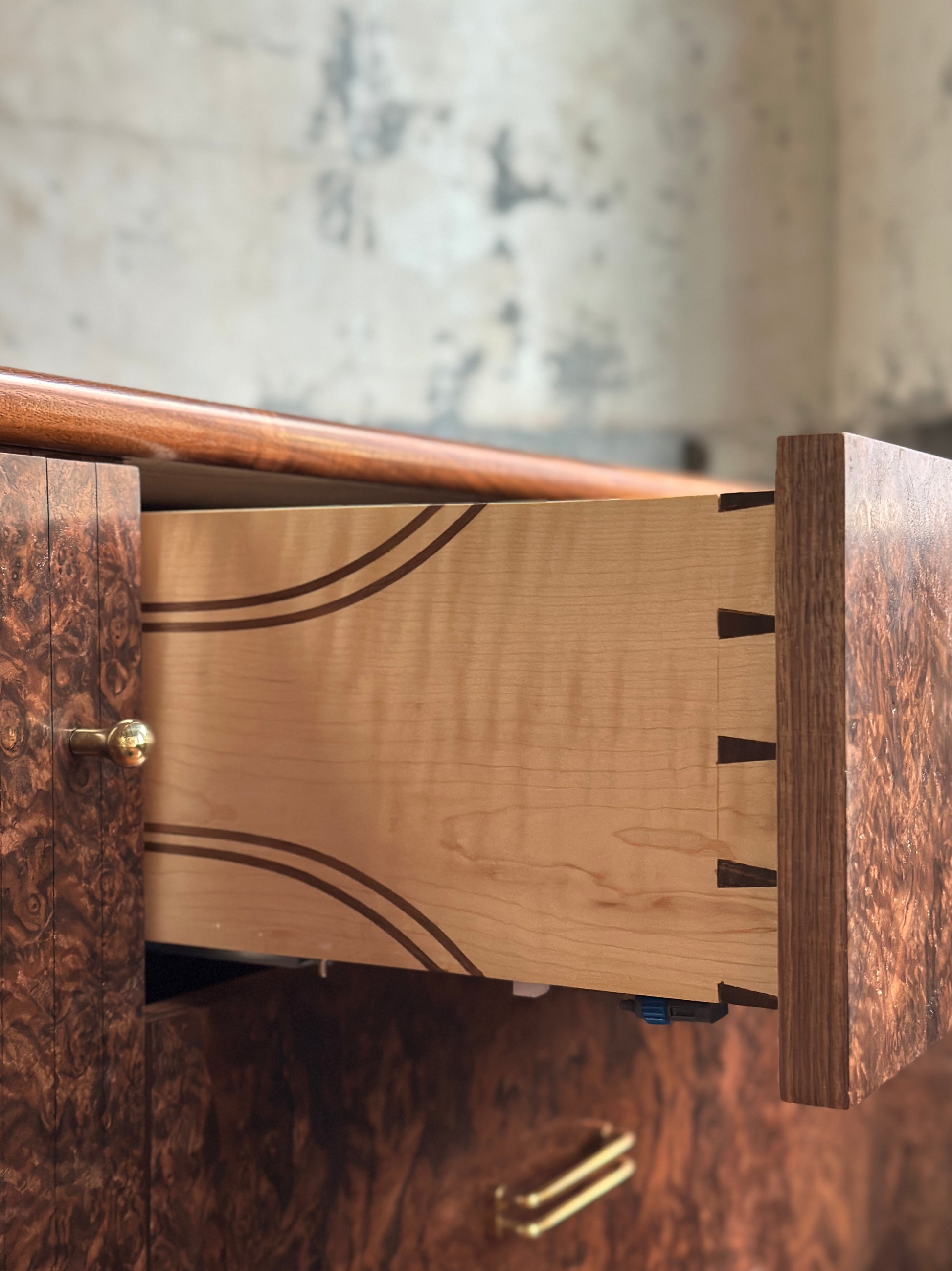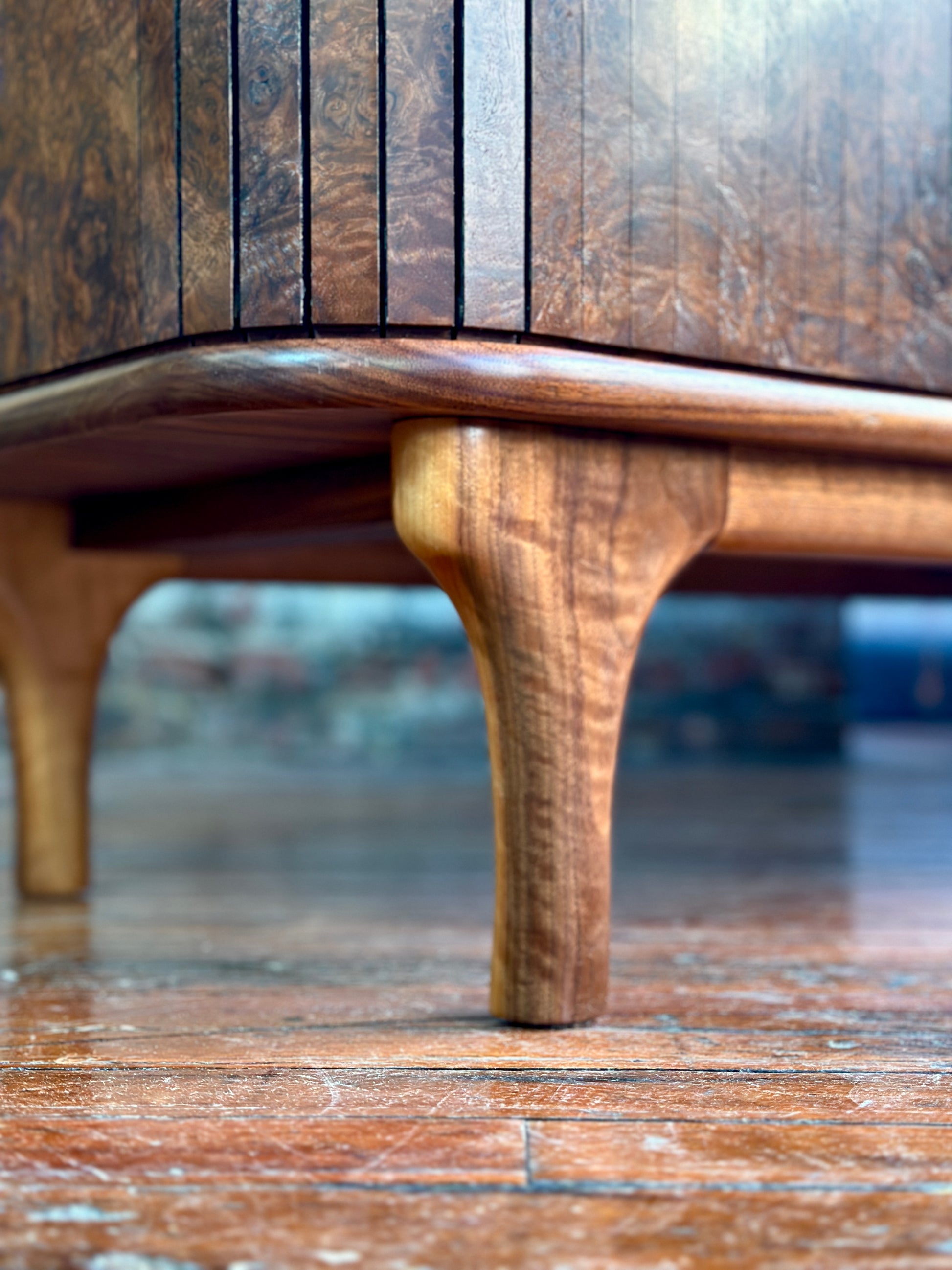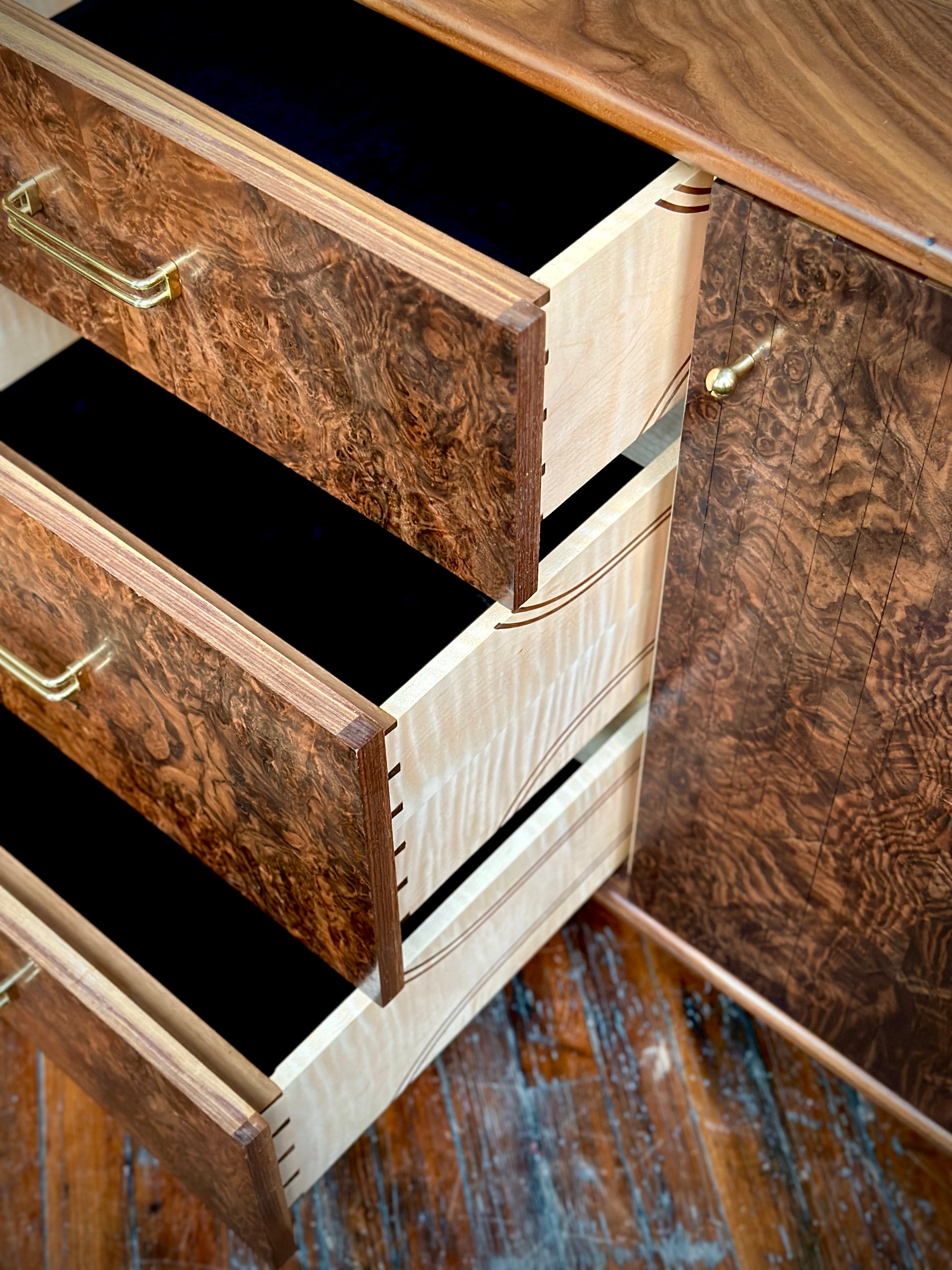 A statement in craftsmanship and material beauty, this handcrafted credenza from Muse Furniture and Design built entirely from solid walnut burl, its swirling grain patterns and rich tonal depth make each piece one-of-a-kind.